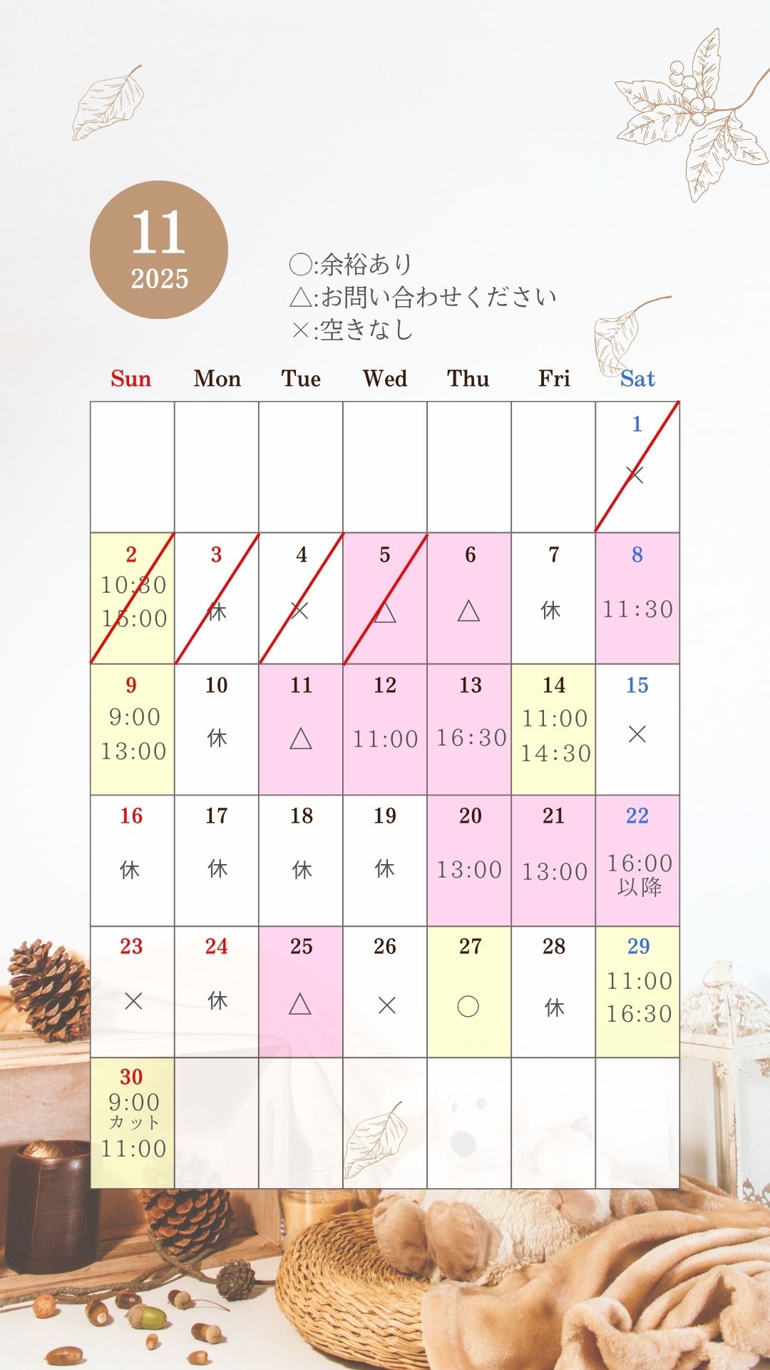 11月の定休日と空き状況/新城市美容室/オリーブ美容室