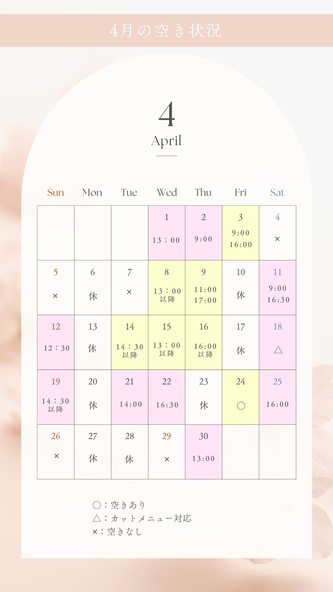 4月の空き状況です♪人気の曜日、お時間は早くに予約が埋まります!お客様のお時間を大切にしたいので余裕を持ったご予約にご協力お願いいたします。